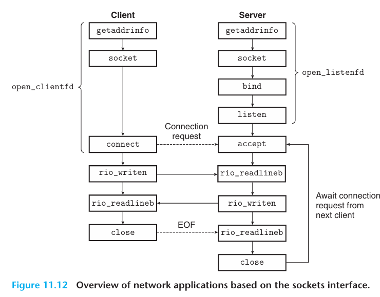 - 클라이언트/서버 헬퍼: open_clientfd(host,port), open_listenfd(port)로 연결 수립/리스닝 소켓 개설을 간단히